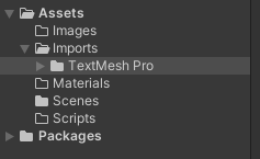 Assets > TextMesh Pro도 임포트된 에셋이기 때문에, 미리 만들어둔 Imports 폴더에 넣어 관리합니다. 앞으로는 Imports 폴더 내에서 분류에 따라 주요 항목을 추가하는 것이 좋습니다. 예를 들어, 텍스트 관련 에셋이나 오브젝트 관련 에셋 등, 필요한 주제별로 분류 시스템을 만드는 연습을 항상 하시기 바랍니다.