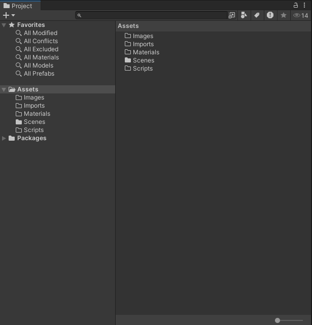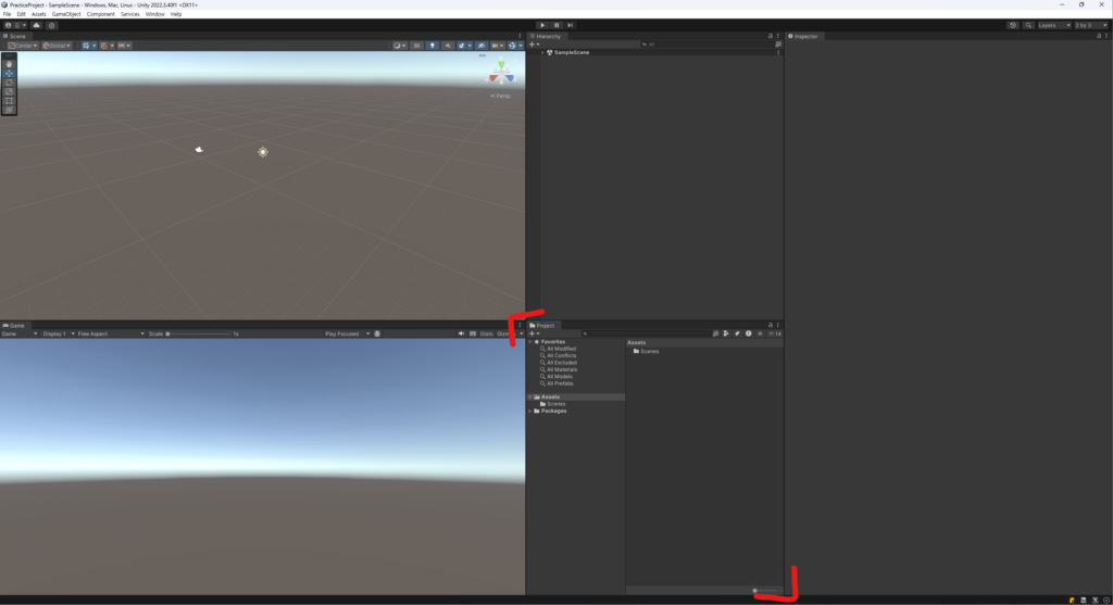 2. Project 탭을 드래그하여 Hierarchy 창에 배치한 다음, Project 창의 중앙을 조정합니다. 그런 다음, 우측 하단의 슬라이드 바를 왼쪽 끝으로 당겨주세요.