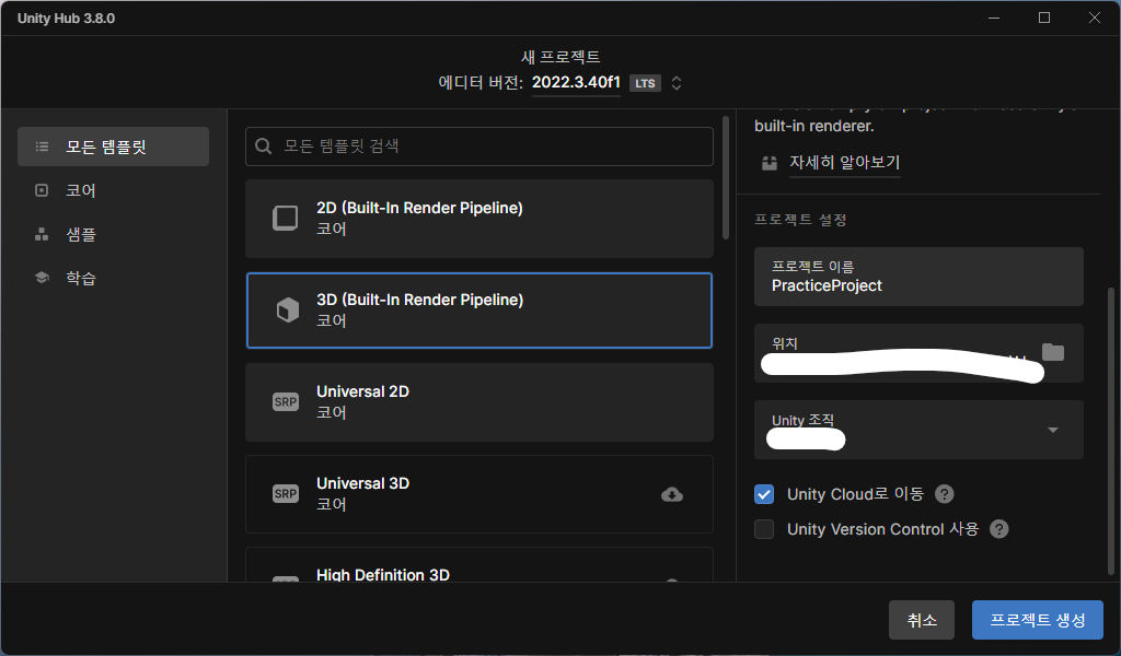 프로젝트 버전은 크게 중요하지 않지만, 최신 LTS(Long Term Support) 버전을 사용하는 것을 권장합니다. LTS 버전은 안정성이 검증된 버전이기 때문에 장기적으로 프로젝트를 진행할 때 유리합니다. 다만, Unity 6 버전에서는 몇 가지 변경 사항이 있으므로, 이 점을 유념하시기 바랍니다. 하지만 이 기본 설정 포스트에서는 해당 변경 사항이 큰 영향을 미치지 않으므로 크게 걱정하지 않으셔도 됩니다.