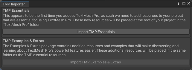 Hierarchy 창에서 마우스 오른쪽 버튼을 클릭하고, UI > Text - TextMeshPro를 선택하면 TMP Importer가 나타납니다. 이때 TMP Essentials를 임포트해주면 됩니다. TMP Examples & Extras는 꼭 임포트하지 않아도 됩니다.