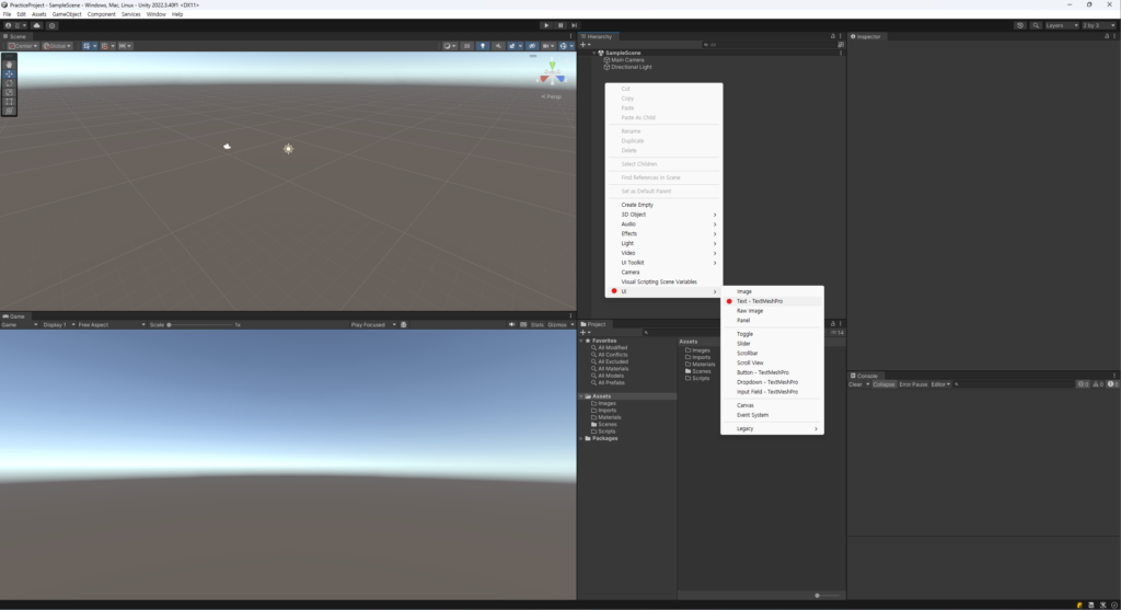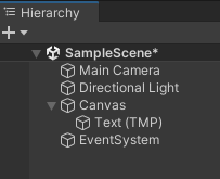 임포트가 완료되면, Hierarchy 창에 Canvas, Text (TMP), EventSystem이 생성되고, Project 창의 Assets 폴더 아래에 TextMesh Pro 폴더가 생성됩니다.