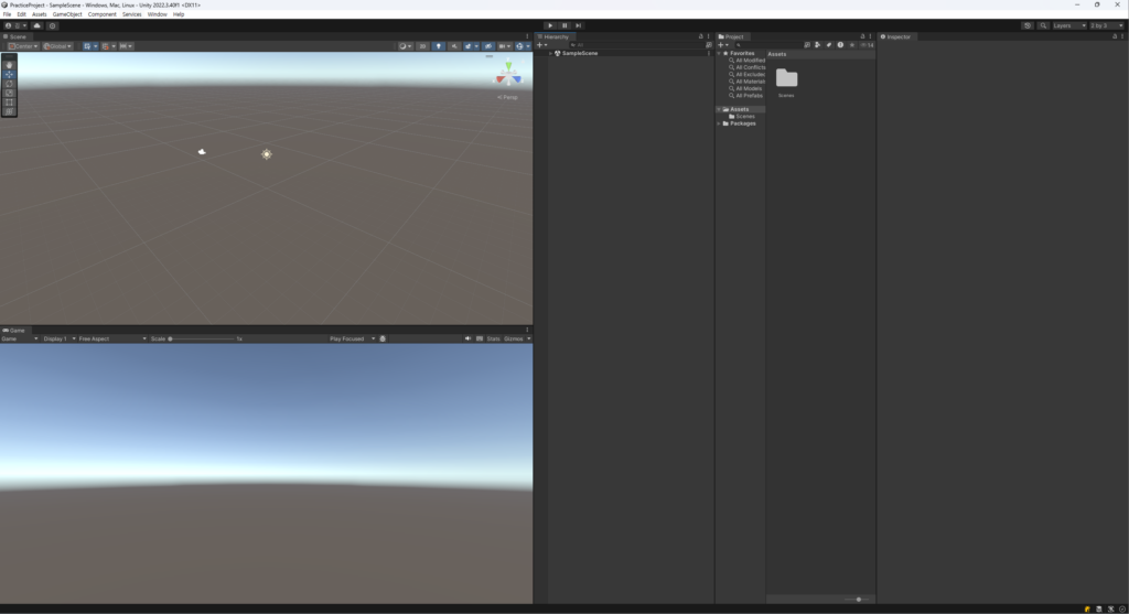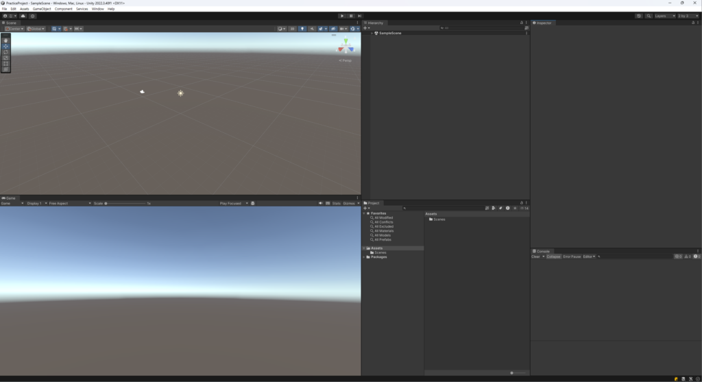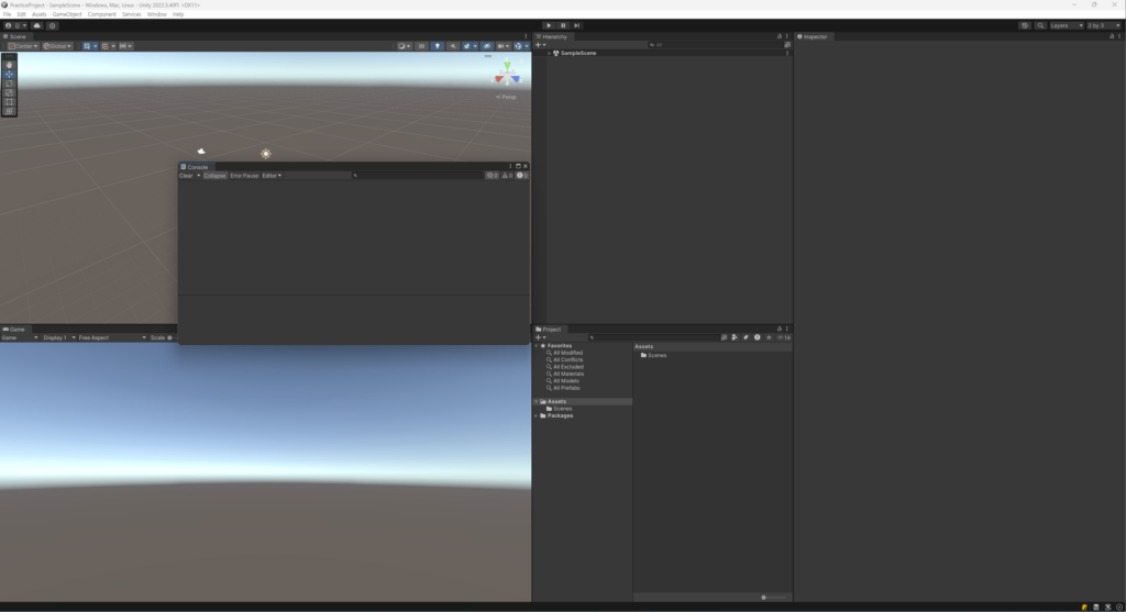 Scene 및 Game 화면의 크기를 가장 크게 조정하고, 너비도 함께 조정했습니다. Console 창의 높이가 Project 창과 일치하지 않는 이유는, Inspector 창에 더 많은 정보가 표시되기 때문이며, 상대적으로 Console 창에는 볼 내용이 적기 때문입니다. 물론, 필요에 따라 Console 창의 높이를 늘릴 수도 있습니다.