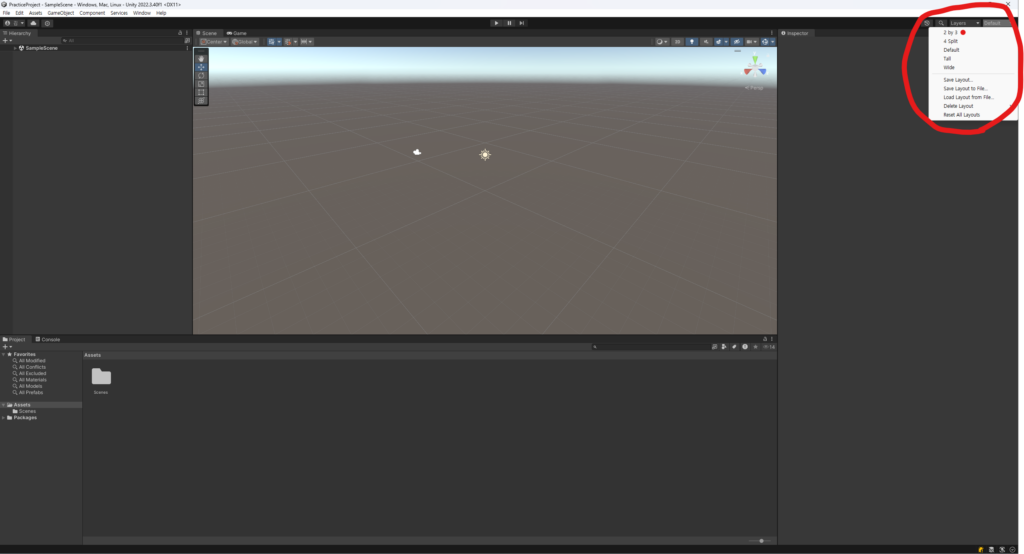 1. Unity Editor 우측 상단의 Default 드롭다운을 클릭하면 기존의 레이아웃 템플릿들이 표시됩니다. 여기에서 2 by 3을 선택해 보겠습니다.