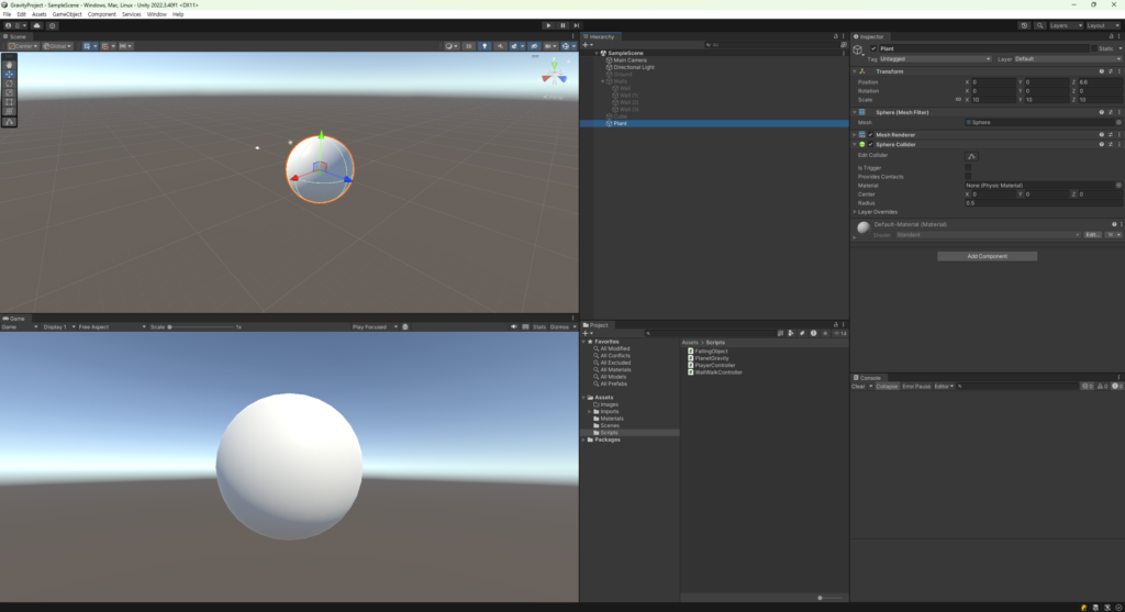 - OnTriggerStay: 트리거 영역 안에 있는 오브젝트에 대해 중력 방향을 계산하고, AddForce로 중력을 가합니다. 중력 방향은 중심점에서 오브젝트로 향하며, 중력의 세기는 조절할 수 있습니다.