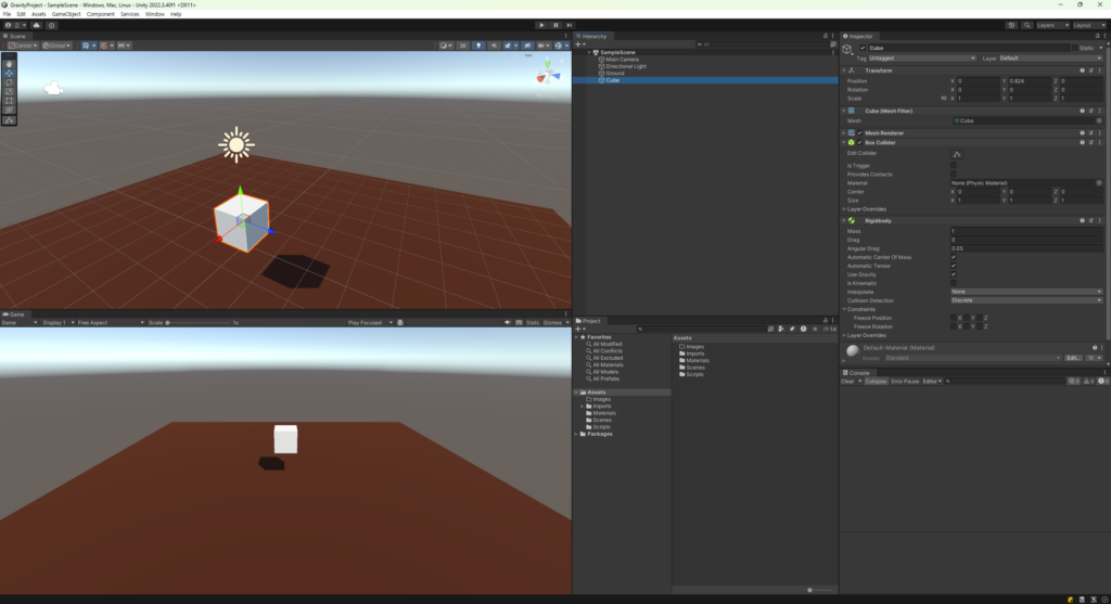 Unity에서 기본 큐브에 Rigidbody를 추가하여 간단한 낙하 물체를 만들고, 낙하 속도를 조절하며 충돌 처리를 구현할 수 있습니다.