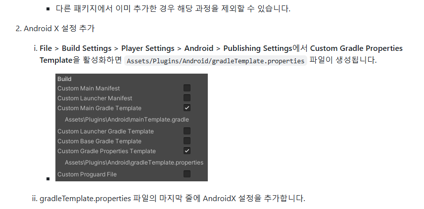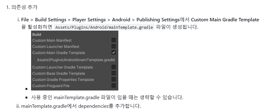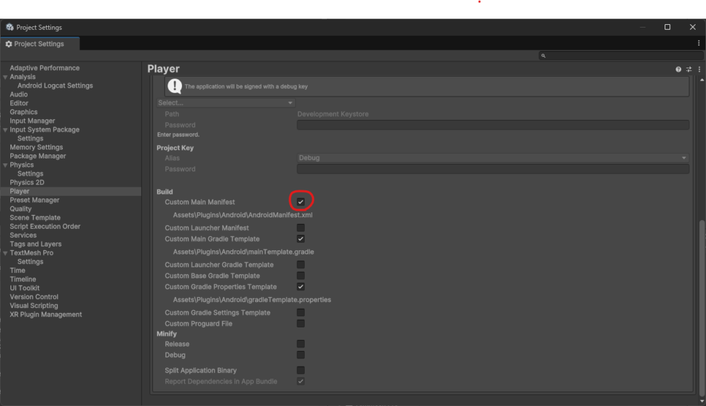 Project Settings > Player > Publishing Settings > Build > Custom Main Manifest 에 체크하여 Custom Manifest를 생성합니다. 위에서 생성한 것들과 함께 모든 커스텀 빌드 파일들은 Assets > Plugins > Android 폴더에 생성됩니다.