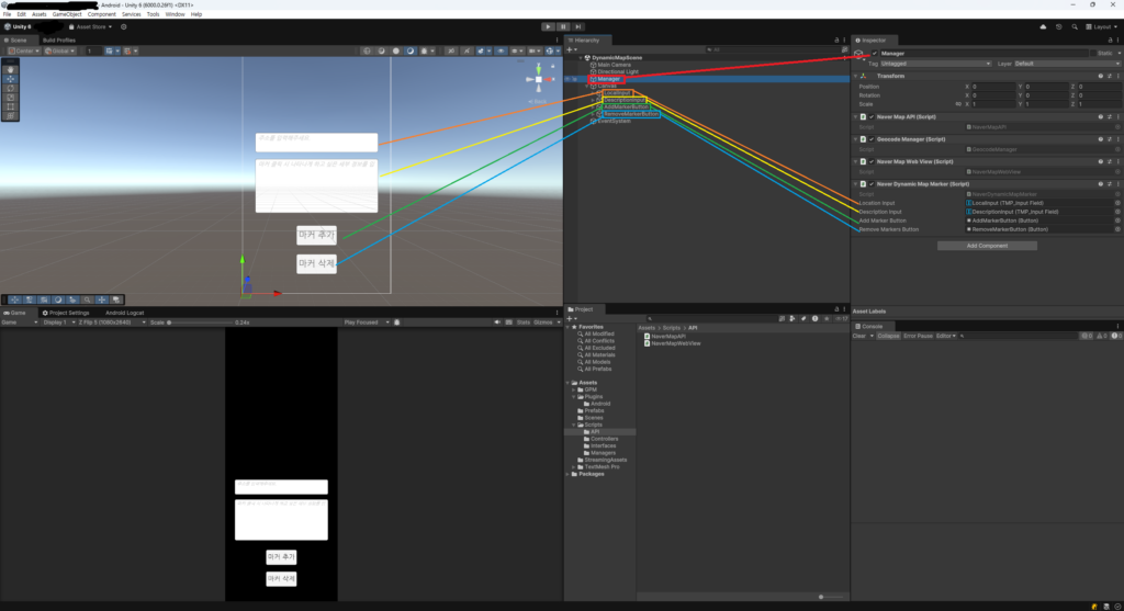 NaverDynamicMapMarker의 직렬화 필드에는 위 스크린샷과 같이 InputField와 Button을 연결해 줍시다.
