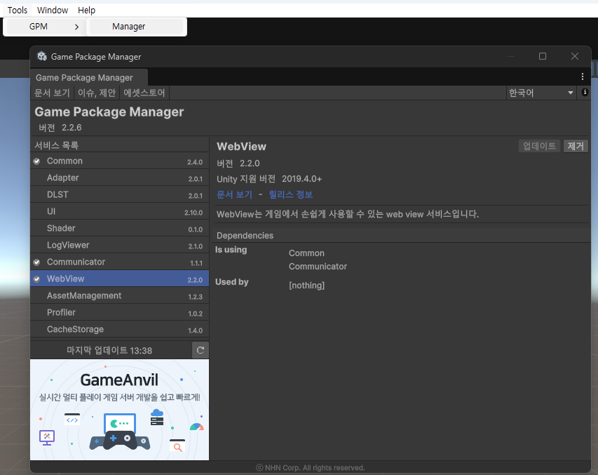 GPM을 Import하면 Unity 에디터 좌측 상단 메뉴 툴바에 Tools라는 탭이 추가됩니다. Tools > GPM > Manager를 클릭하면 Game Package Manager가 열립니다. 이곳에서 서비스 목록 중 WebView를 선택하여 설치를 완료하면 됩니다.