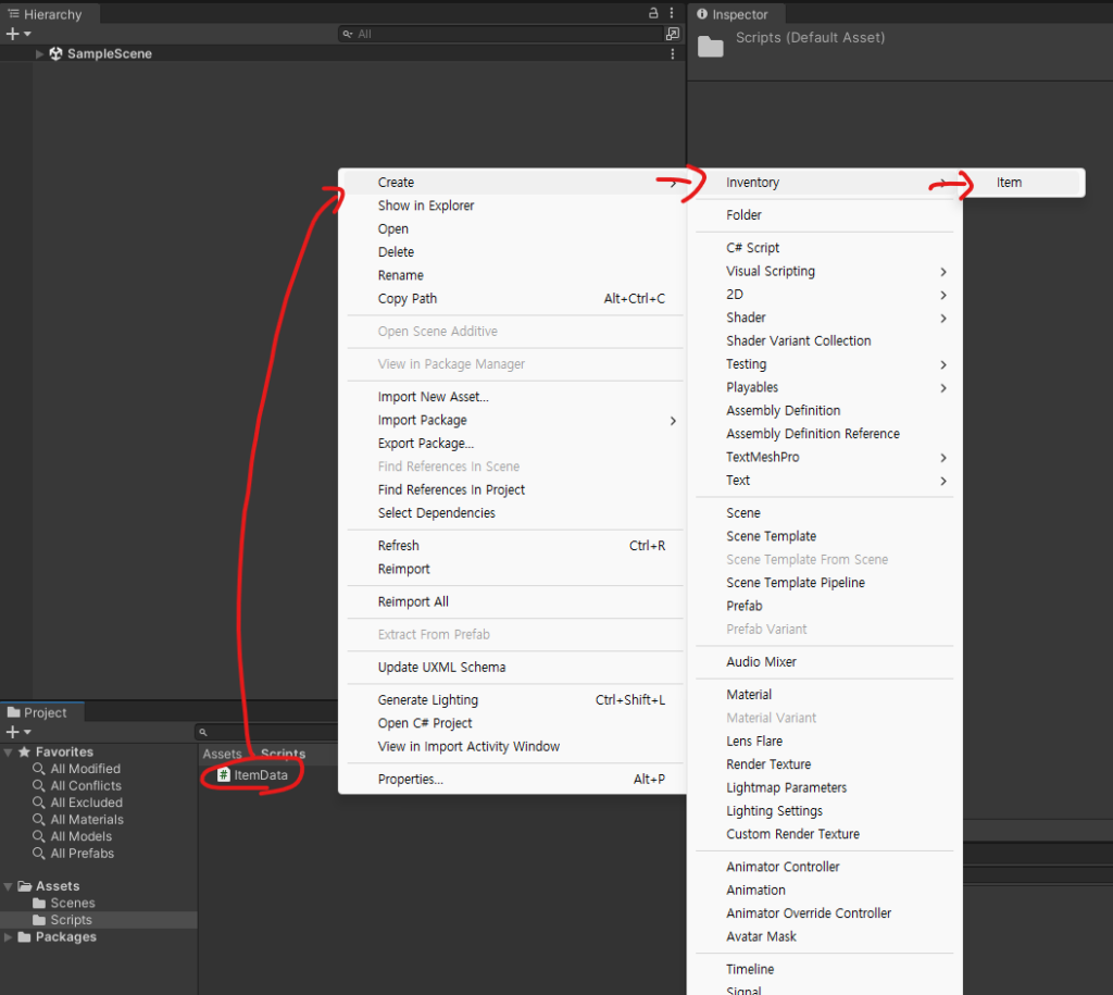 - 프로젝트 창에서 우클릭 > Create > Inventory > Item을 선택합니다.