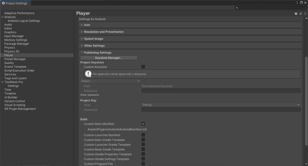Build Settings 창의 왼쪽 하단에 있는 Player Settings 버튼을 클릭하여 Player Settings 창을 엽니다. 이후 Player 섹션의 Publish Settings 탭으로 이동하여 Build 그룹에 있는 Custom Main Manifest 옵션을 체크합니다. 이 작업을 완료하면 Assets > Plugins > Android > AndroidManifest.xml 경로에 XML 파일이 생성됩니다.