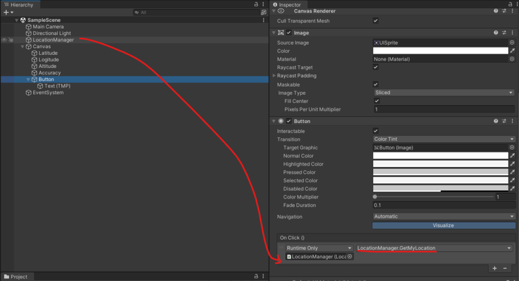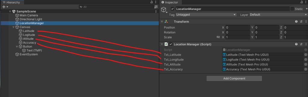 Hierarchy에서 빈 오브젝트를 생성한 후 이름을 LocationManager로 설정합니다. 이후 이 오브젝트에 LocationManager 스크립트를 추가하고, 각 텍스트 항목에 맞게 Text Object를 연결합니다.
