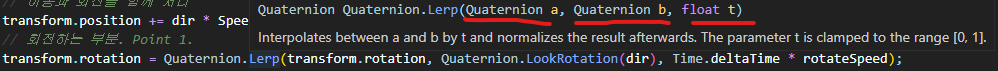 이렇게 되어있습니다. 간단히 .Lerp(회전각 a에서, 회전각 b까지, t의 속도로 회전)이라고 이해하시면 편합니다. 우리의 코드를 보면 "현재 회전각(transform.rotation)에서 바라보는 방향(Quaternion.LookRotation(dir)) 까지 우리가 지정한 회전속도(Time.deltaTime * rotateSpeed) (deltaTime은 속도 보정값)로 회전한다"임을 알 수 있습니다.