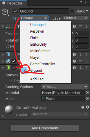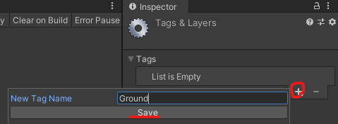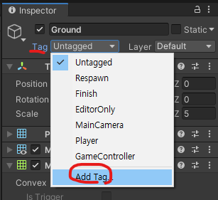먼저 Ground에 태그를 추가해주도록 합니다. 저는 태그명 또한 Ground로 설정하겠습니다.