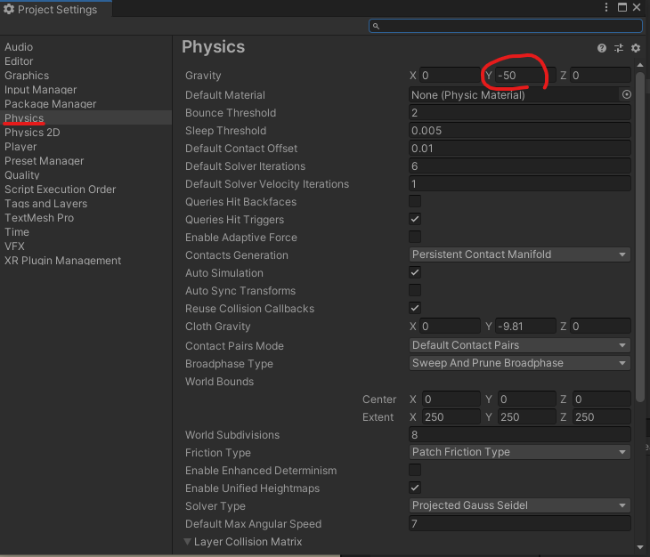 점프를 하다 보면 낙하하는 속도가 너무 낮다고 느끼시는 분도 계실 것 같습니다. 그럴 때는 [Edit] -> [Project Settings]의 Physics 에서 Gravity의 Y부분을 더욱 낮게 조정해주시면 됩니다. 해당 부분은 중력가속도를 설정하는 부분입니다.