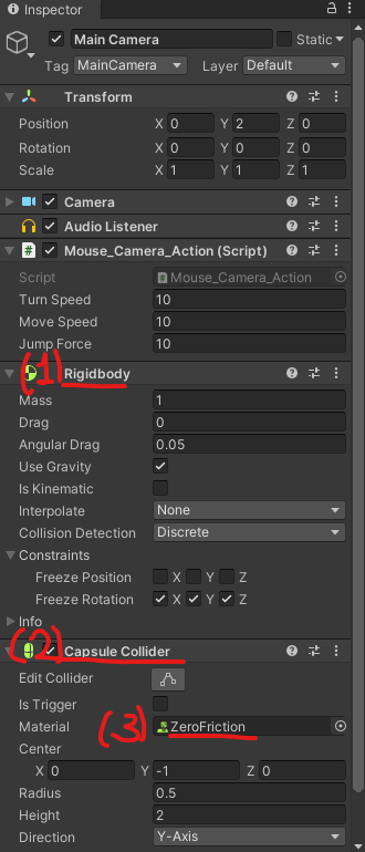 스크립트가 등록되었다면, 중력을 부여하고 점프를 구현할 수 있도록 (1)Rigidbody와 (2)Collider를 추가해주도록 합시다. 저는 Capsule Collider를 추가하였습니다. 그리고, Collider에 지난번에 만든 (3)ZeroFriction을 넣어 벽에 달라붙지 않도록 처리해줍니다.
