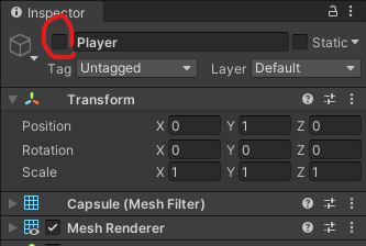 해당 스크립트를 작성하셨다면 이제 유니티로 가서 나머지 설정을 추가해줍시다. 이 스크립트는 1인칭 시점을 기준으로 만들었기 때문에 플레이어 캐릭터가 별도로 필요하지 않게 만들었습니다. 그러므로 이전에 만들어둔 Player는 잠시 꺼주도록 합시다.