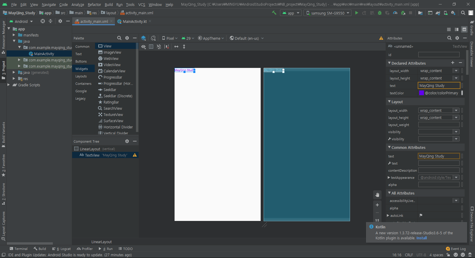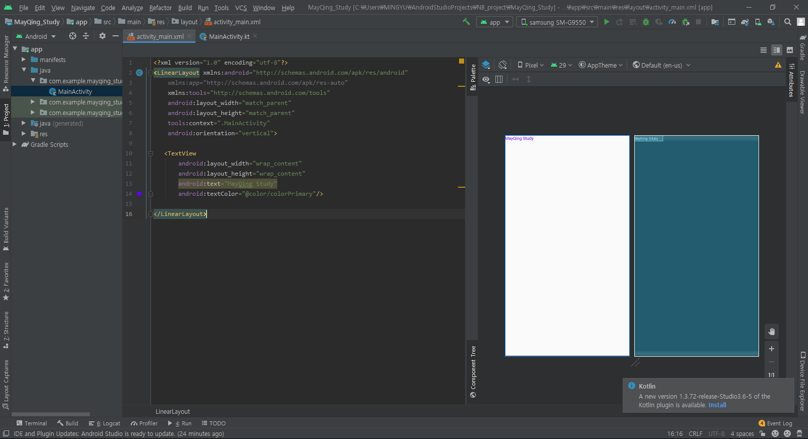 텍스트뷰를 간단히 소개하자면, TextView 내에서 text를 추가하려면 android:text = "쓰고 싶은 텍스트"를, 텍스트에 색을 입히고 싶다면 android:textColor = "#칼라코드" 또는 "@color/~"를 추가하면 됩니다. 이것 또한 차후 포스팅에서 자세히 설명드리겠습니다.