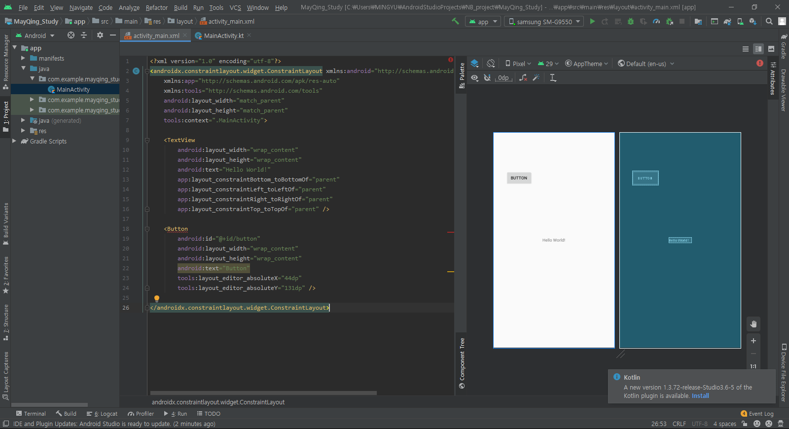 여기에서 가운데에 있는 TextView와 Button을 지우고 나서 두번째 줄의 androidx.constraintlayout.widget.ConstraintLayout를 LinearLayout으로 바꿔줍니다.