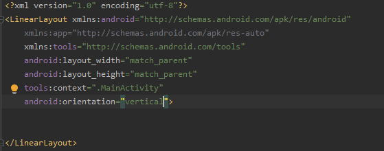 위의 구문을 바꾸면 맨 밑의 구문도 동시에 바뀌는 것을 알 수 있습니다. 또한 LinearLayout(선형 레이아웃)은 정렬방식을 지정해주어야 하는데, 그것은 맨 밑의 orientation을 추가함으로써 구현할 수 있습니다.