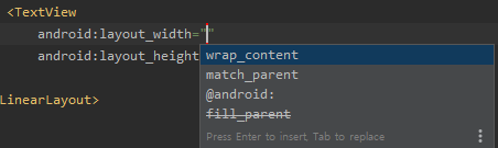 속성값을 보면 wrap_content와 match_parent를 볼 수 있는데, 각각 '내용물의 크기에 맞게'와 '부모의 크기에 맞추어' 라고 해석하시면 됩니다. 여기서의 부모는 해당 뷰 컴포넌트의 상위 뷰 컴포넌트를 의미하는데, 자세한 설명은 차후 포스팅에서 다루도록 하겠습니다.