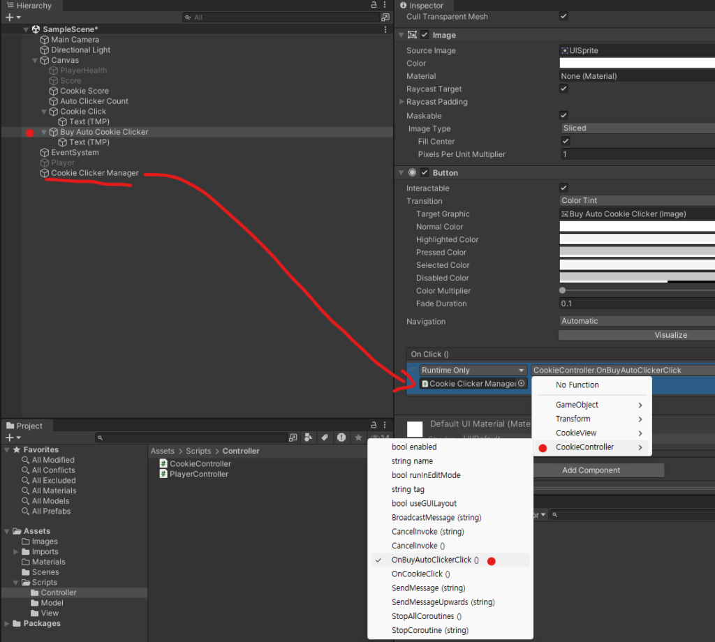 - 두 번째 버튼은 CookieController의 OnBuyAutoClickerClick 메서드를 호출하도록 설정합니다.