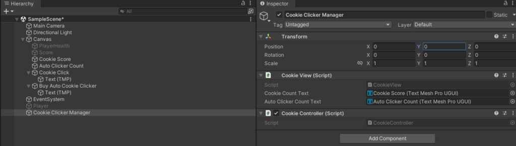 - CookieController와 CookieView 스크립트를 동일한 GameObject (Cookie Clicker Manager)에 추가하고, TextMeshProUGUI 필드를 Unity 에디터에서 설정합니다.