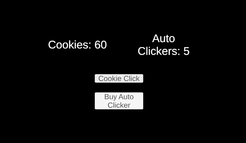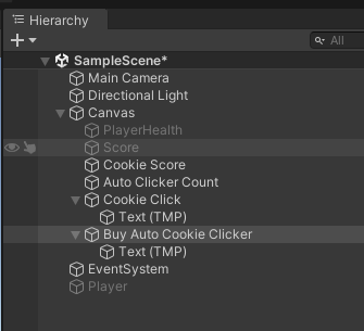 - Canvas를 추가하고, 그 안에 Button 두 개(Cookie Click, Buy Auto Cookie Clicker)와 TextMeshPro - Text 두 개(Cookie Score, Auto Clicker Count)를 배치합니다.