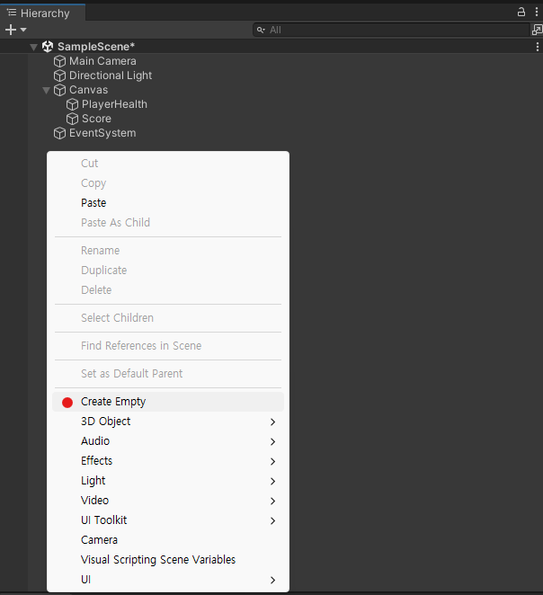 - 빈 오브젝트를 생성하고 Player라고 명명합니다.