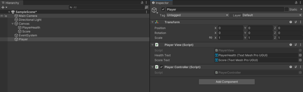 - Player 오브젝트에 위에서 작성했던 PlayerView Script와 PlayerController Script를 부착합니다.