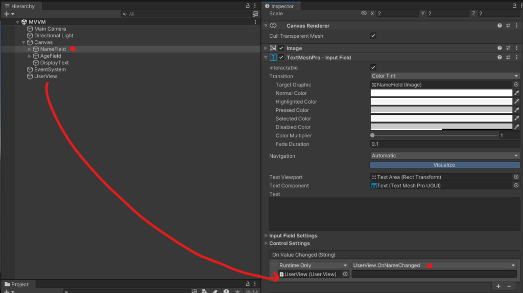 - 이벤트 설정: On Value Changed 이벤트에 UserView 스크립트의 OnNameChanged(이름 입력 필드의 경우)와 OnAgeChanged(나이 입력 필드의 경우) 메서드를 연결합니다. 이를 통해 사용자가 InputField에 값을 입력할 때마다 해당 메서드가 호출됩니다.