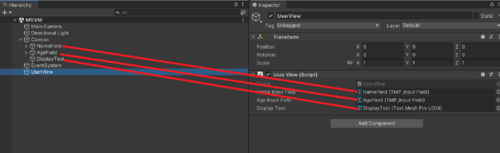 - 작업: UserView 스크립트가 추가된 GameObject를 선택한 상태에서, Inspector 창에서 nameInputField, ageInputField, displayText 필드에 각각의 UI 요소를 드래그 앤 드롭하여 연결합니다.